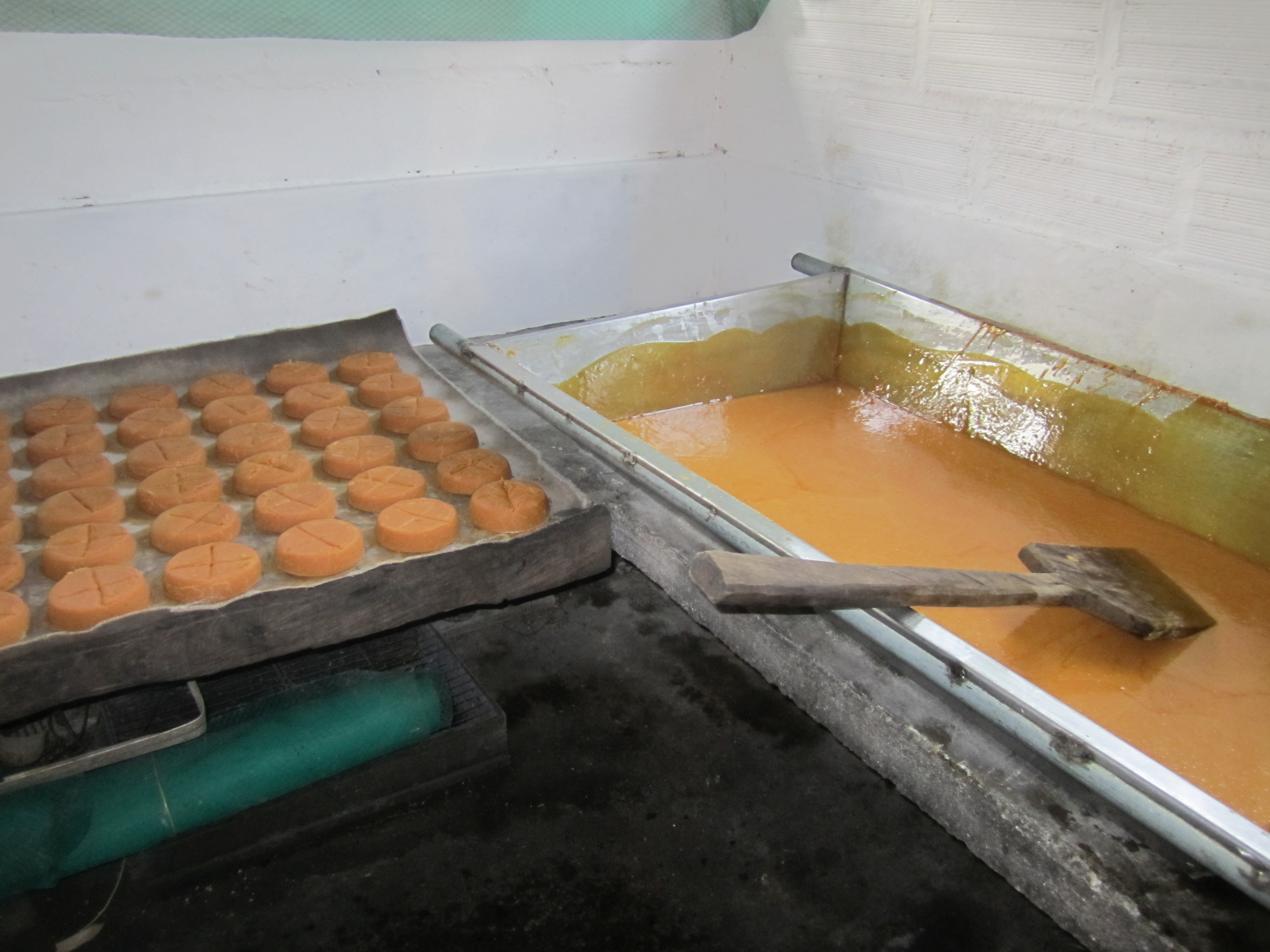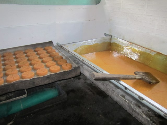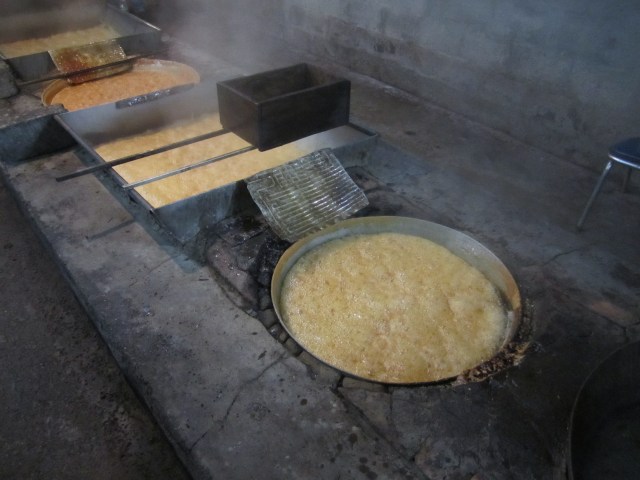 Once it has thickened up enough, it is transferred to a large vat where it is stirred and cooled. When it had cooled to a carmelly/taffy stage, they gave us some to try. It was delish and tasted not quite like anything we’d ever had before.