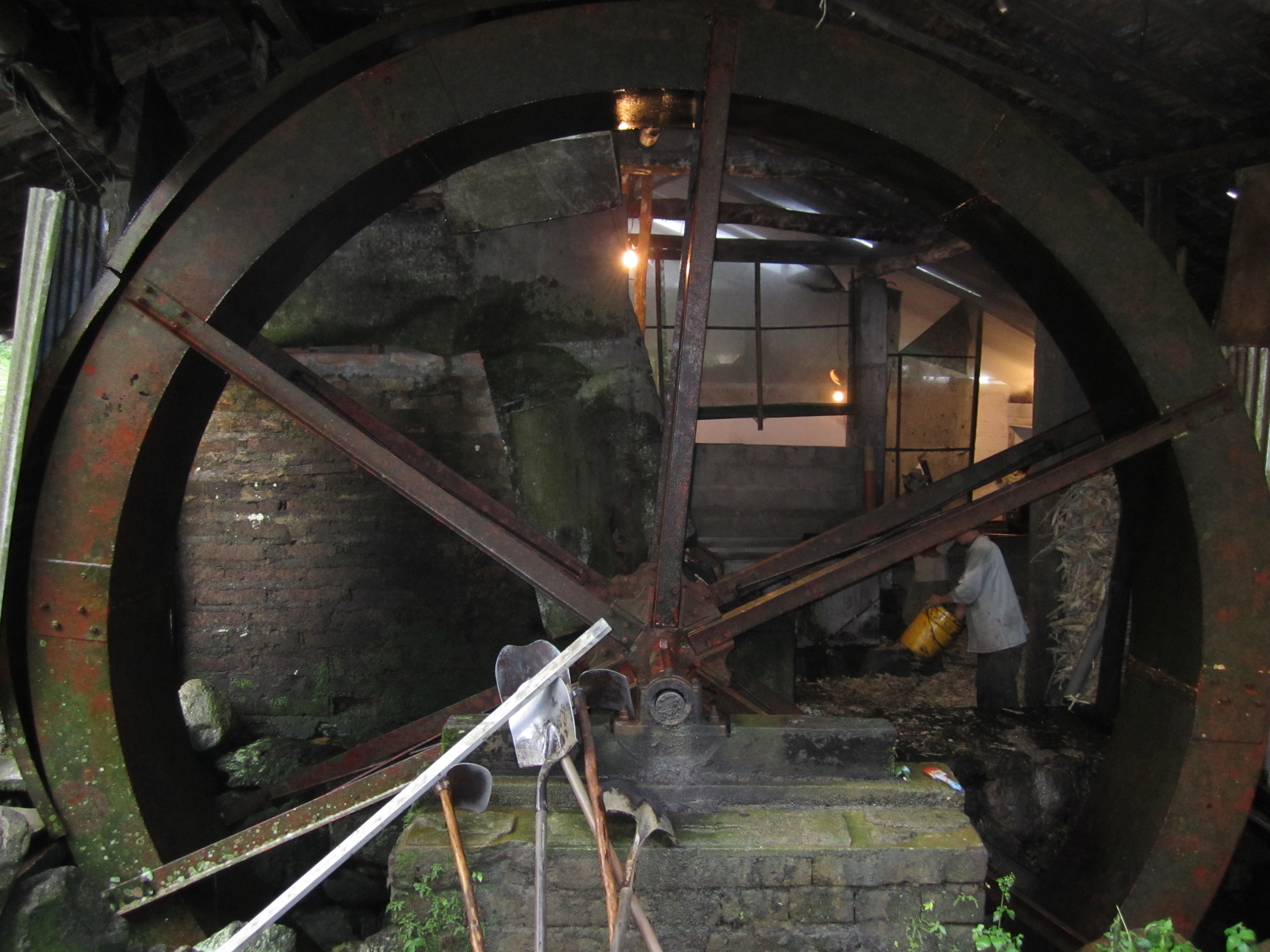 First, a huge waterwheel powered by the river, squeezes the juice from the sugar cane.
