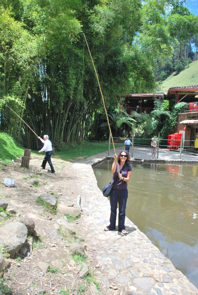 Not to be outdone by the coffee, Jardin also has many different trout farms.  It seems like the lush green hills and clean flowing water are a perfect match for trout and man to do battle.  We ventured out to one of these little establishments to see what we could learn.  We were greeted by rows of flowing water stuffed with rainbow trout of all different sizes.