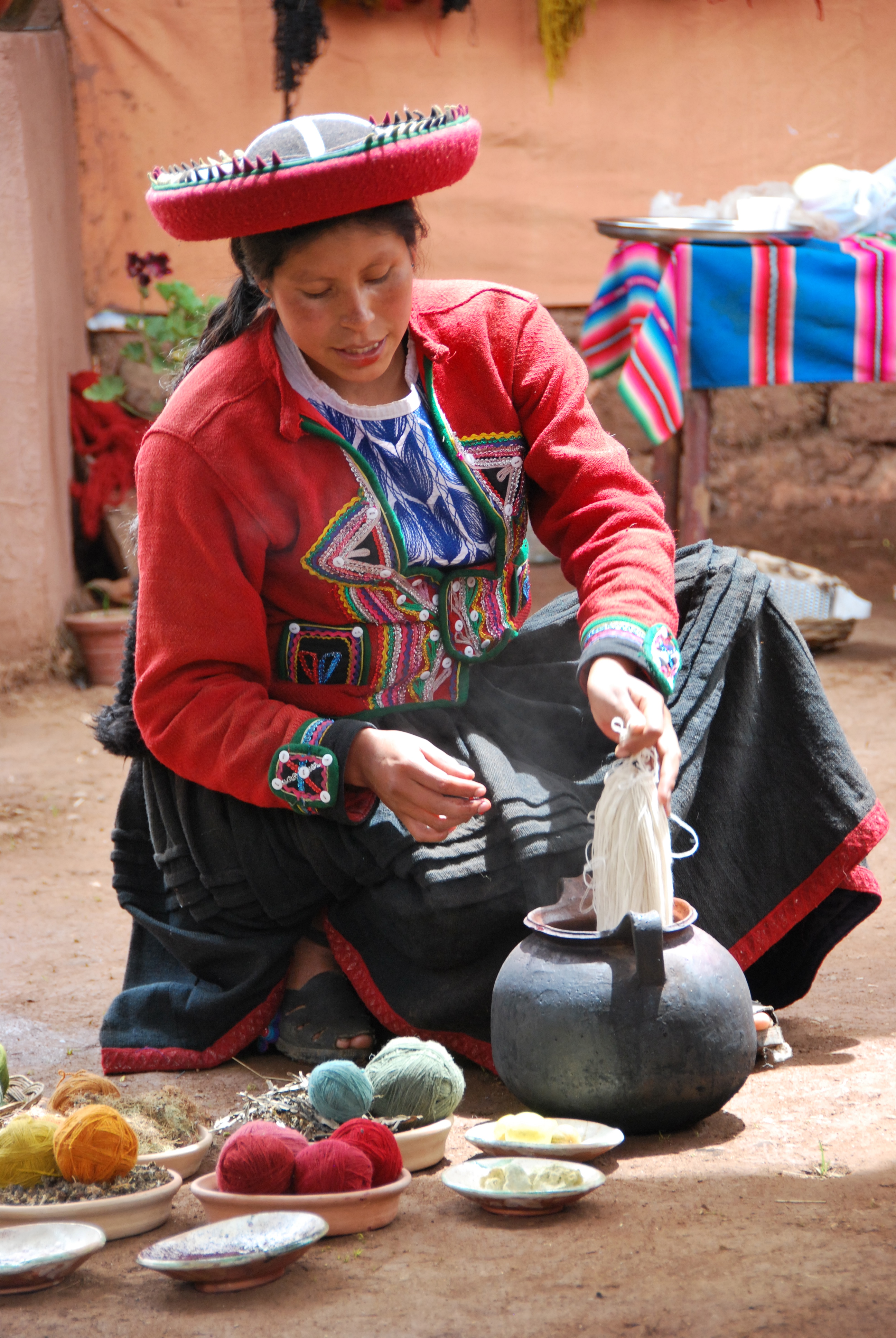 We took it easy during our time there in order to rest up before the hike and because Teresa wasn’t feeling too well. Before you ask, it wasn’t “stomach issues” like everyone there assumed. She thinks that she caught some sort of bug before she even got to Peru. She was a trooper and we were still able to see and do quite a bit. One day we took a day tour to a few of the sights located outside of Cusco. Our first stop was at a local artisan shop, which was actually an interesting place and it had a some decent deals- Teresa couldn’t resist picking up another llama sweater. They went through a demonstration on their traditional knitting and weaving process.