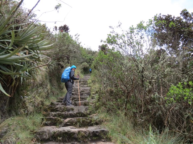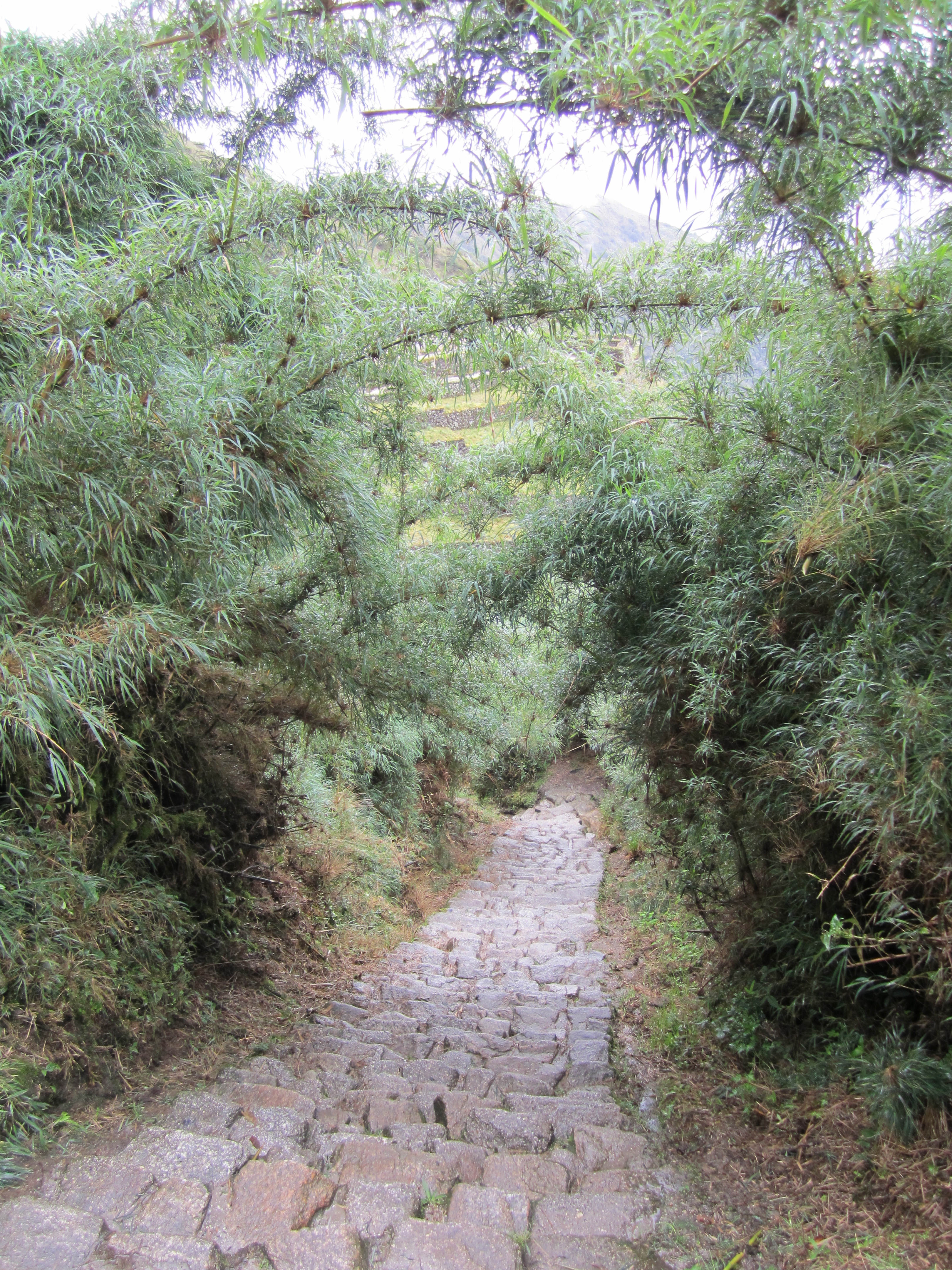 We stuffed ourselves with another amazing meal and hit the trail. Immediately, we were challenged by nearly 1,500 feet of Incan stairs and light rain.