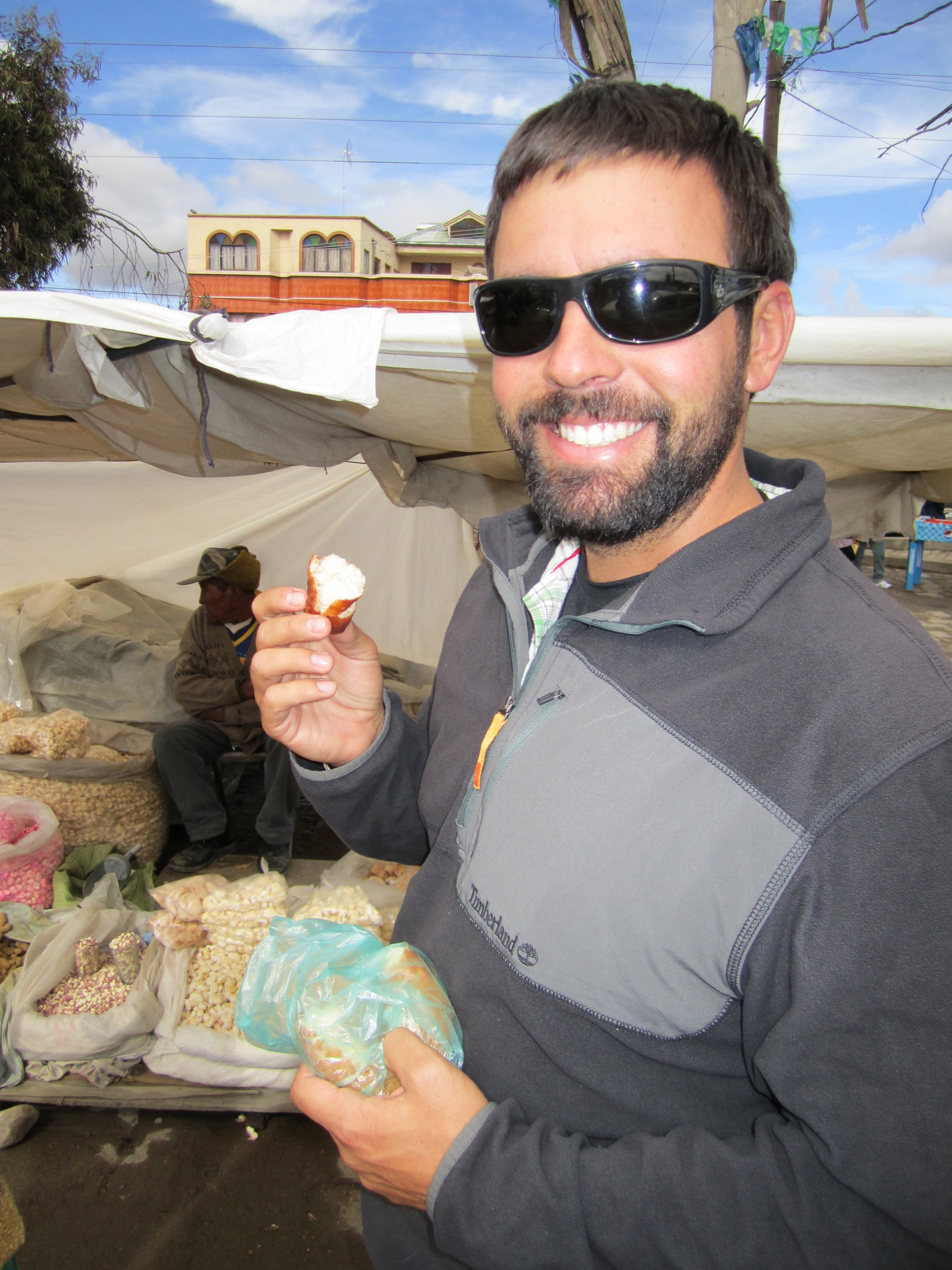 After being skipped over many times, Kristen got pushy, wedged her way in there, and held out her tickets. I guess lines don’t really exist when it comes to good lunch. When our tickets finally got selected, it was like winning the lottery: juicy and tender chicken, potatoes, sweet potatoes, salad, and a sweet baked banana. As we wedged ourselves on to a bench between locals, we both agreed that it was one of the best chicken meals we have ever eaten. Seriously, go to El Alto on a Thursday or Sunday (market days) just to eat. You won’t regret it. (And it didn’t make us sick.)