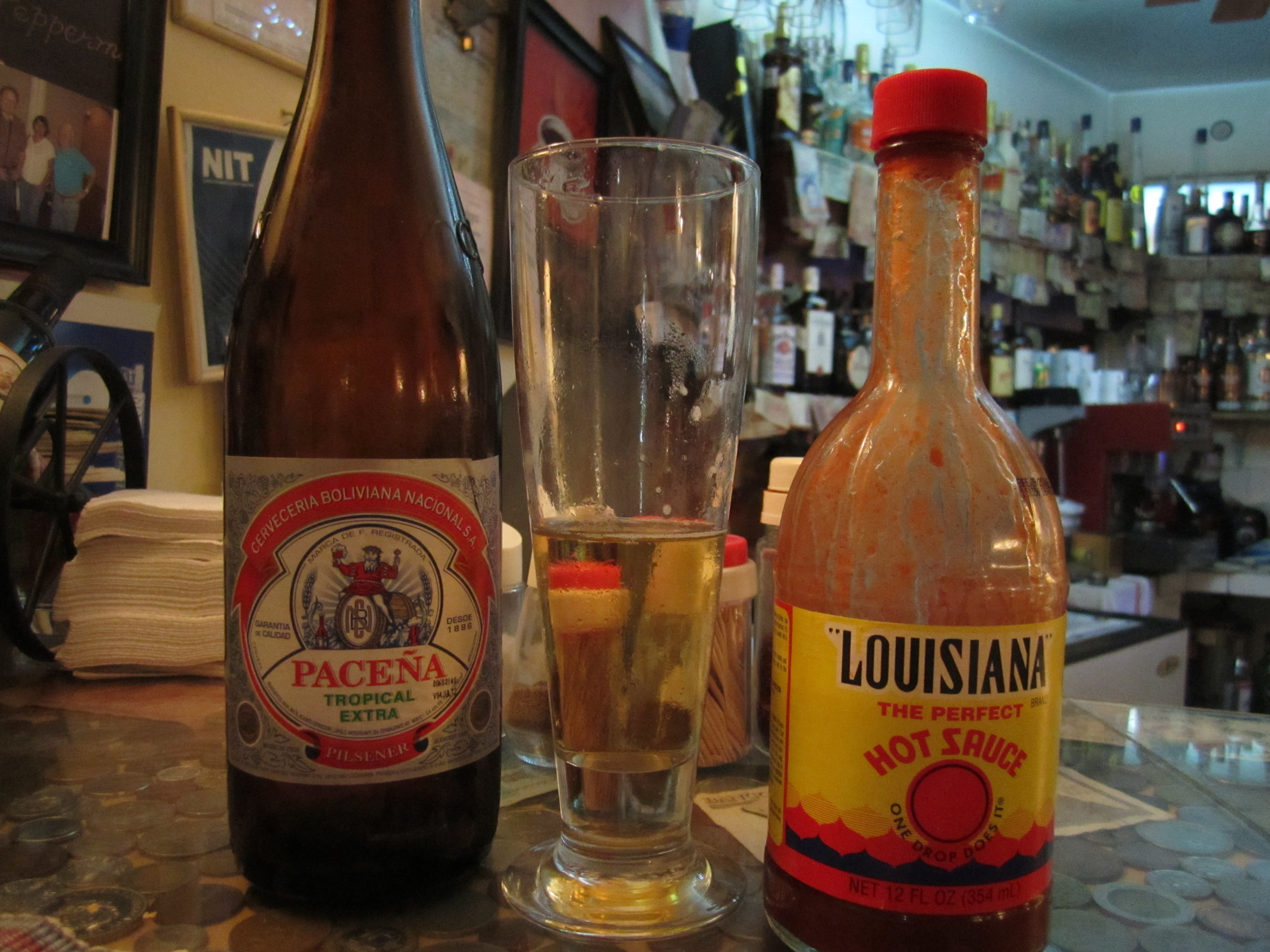 Peceña and (one of) Joe's favorite hot sauces from home. He almost couldn't decide which one to drink.